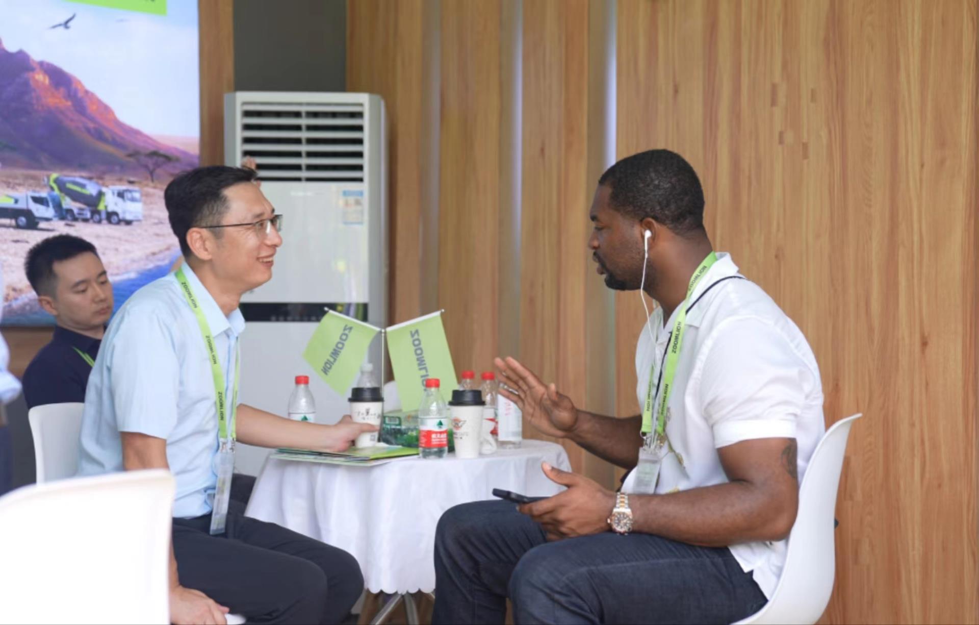 與此同時(shí),另一邊,工作人員也正在向一位來自阿爾及利亞的客戶介紹中聯(lián)重科的挖掘機(jī)。這款產(chǎn)品配備了定制化的康明斯發(fā)動(dòng)機(jī)和大容量的方斗,能夠在非洲的各種環(huán)境中作業(yè)無礙,施工效率也得到了進(jìn)一步提升,在當(dāng)?shù)赜兄盎苁帧钡拿雷u(yù)。