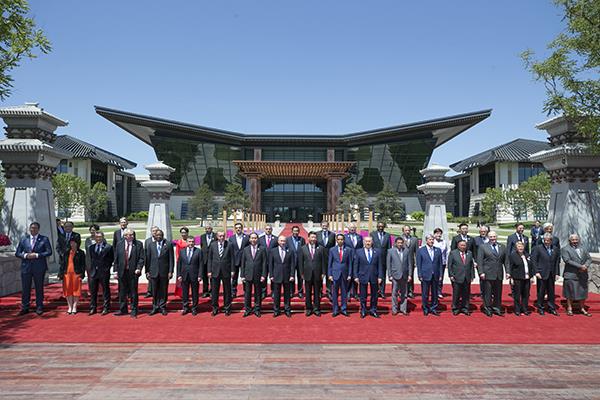 5月15日,“一帶一路”國際合作高峰論壇在北京雁棲湖國際會議中心舉行圓桌峰會,國家主席習(xí)近平主持會議并致辭。這是當(dāng)天中午,習(xí)近平同與會領(lǐng)導(dǎo)人和國際組織負(fù)責(zé)人以國際會議中心“漢唐飛揚(yáng)”主建筑為背景集體合影。(姚大偉 攝)