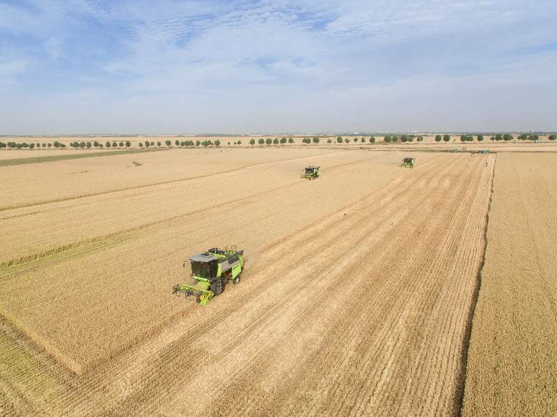 ▲中聯(lián)重科收割機(jī)在金色的麥田里作業(yè)