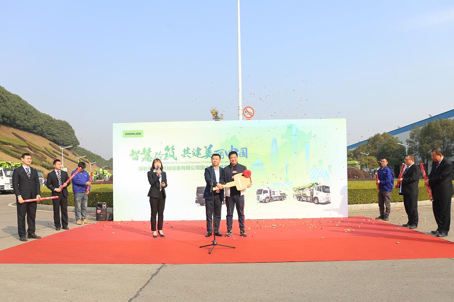10:30分,隨著中聯(lián)重科混凝土機(jī)械營銷公司副總經(jīng)理陳航將代表著匠心和財富的金鑰匙交付給程祖寶后,一輛輛戴著紅花的4.0系列國六混凝土泵車、車載泵緩緩駛出麓谷工業(yè)園,開啟了助力大灣區(qū)深圳項目及貴州地區(qū)項目建設(shè)的新征程。