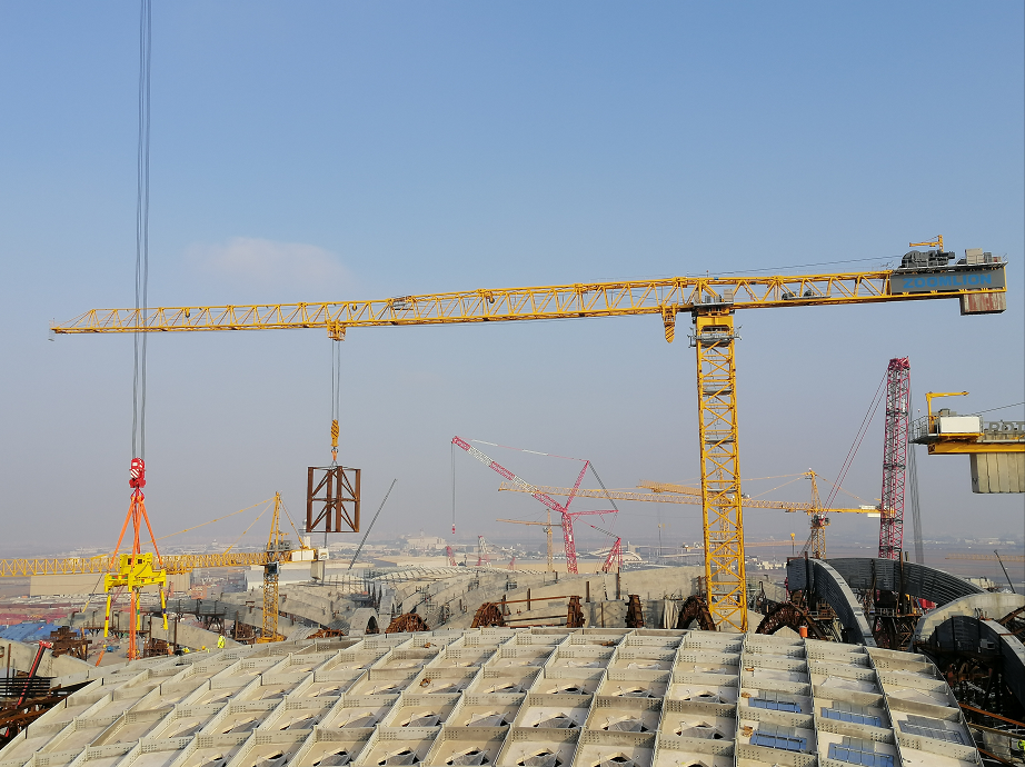 資料顯示,科威特新機(jī)場是該國的主要項目之一,預(yù)計工期為6年。新機(jī)場的容量為年1300萬人次,后期會增加至2500萬人次。該項目將有助于將科威特打造成為重要的區(qū)域中心。新機(jī)場航站樓的核心區(qū)域?yàn)橐粋€巨大的穹頂,使用鋼結(jié)構(gòu)和混凝土PC構(gòu)件組成,施工頗具挑戰(zhàn)性。鋼構(gòu)件銜接吊裝對塔機(jī)的起升平穩(wěn)性和微動性有極高要求;混凝土PC構(gòu)建單件物件重,除了需要塔機(jī)具有良好的微動性能外,還要有強(qiáng)大的起重能力;此外,作為航站樓的中心部分,吊裝物料重、工作量大,對塔機(jī)的穩(wěn)定性也提出了較高的要求。