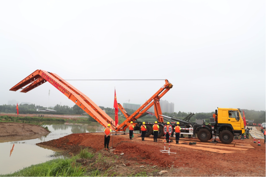 ? ?在“搭建臨時道路、橋梁”演練科目中,模擬了雨情、水情快速發(fā)展導致長沙市望城某區(qū)域洪水沖毀了道路、橋梁,搶險救援物資無法運抵現(xiàn)場的緊迫場景。危難之時,中聯(lián)重科重型工程機械應急救援隊和駐湘武警某部交通**一支隊緊急出動應急架橋車和鋪路車進行搶險。演練中,中聯(lián)重科應急架橋車停在損毀的橋梁邊,指揮員、安全員、操作手,迅速到位。應急架橋車底盤穩(wěn)健展平,操作機手手持遙控器,沉穩(wěn)架設,短短14分鐘,一座長25米、寬3.2米的臨時橋梁就已搭建完畢,迅速恢復了通行。該臨時橋梁可承載30噸,**大限度保障人員、設備、物資安全通過。
