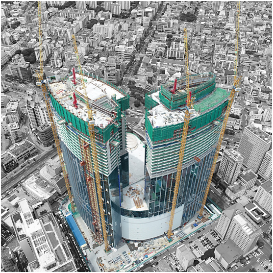 △中聯(lián)重科塔機(jī)群在韓國一線建筑公司大宇建設(shè)某項(xiàng)目工地施工