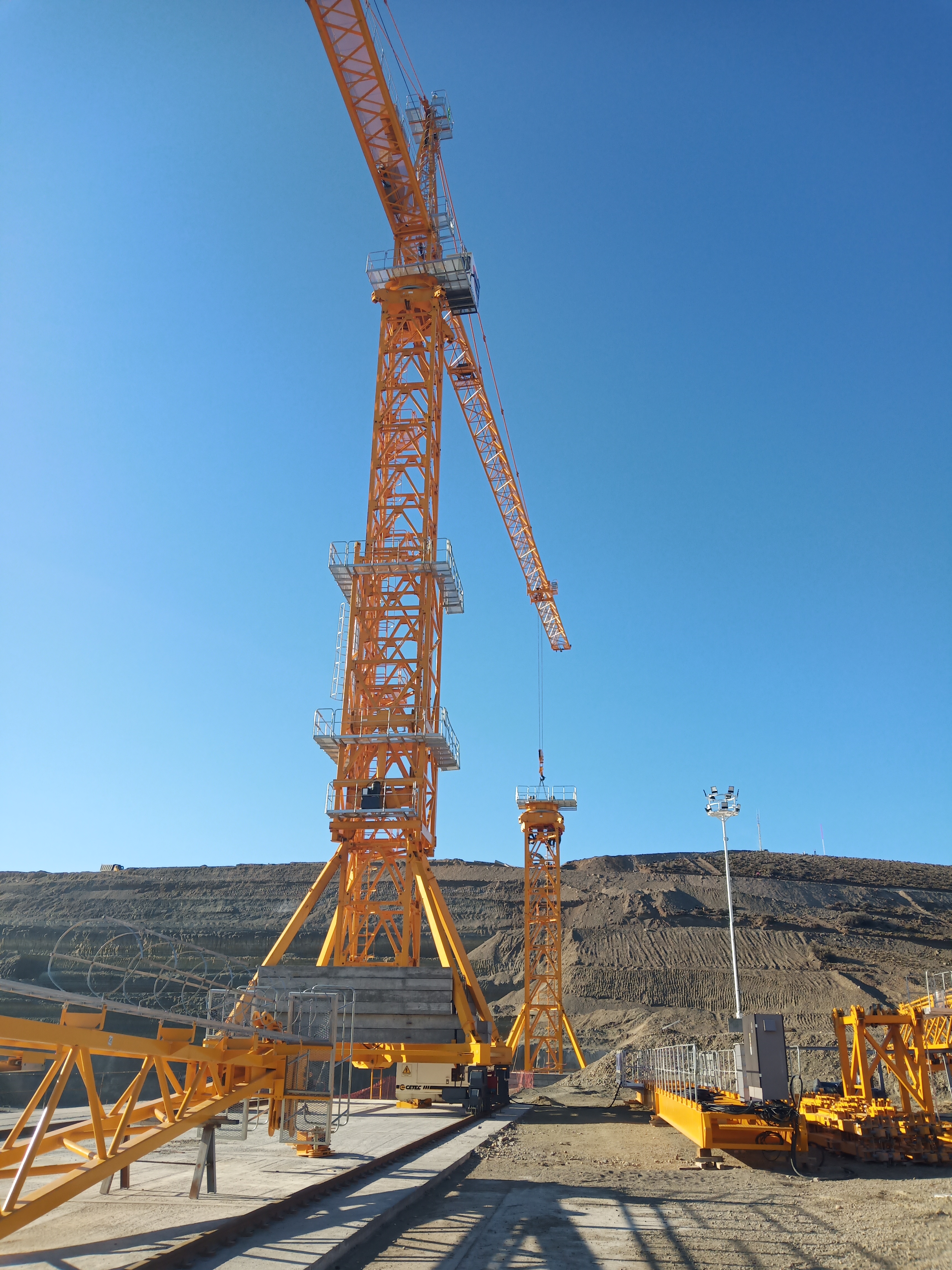 在這種極端條件下,中聯(lián)重科攜手承建商中國能建葛洲壩集團(tuán),為項(xiàng)目供應(yīng)了多臺錘頭式塔機(jī)TC7052-25和D800-42投入使用??紤]到此項(xiàng)目氣候環(huán)境較為復(fù)雜,且設(shè)備需要極高的抗風(fēng)能力,中聯(lián)重科研發(fā)團(tuán)隊(duì)針對該項(xiàng)目做了一系列特殊化設(shè)計(jì),如采用片式標(biāo)準(zhǔn)節(jié)結(jié)構(gòu),節(jié)片間用經(jīng)特殊處理過的銷軸連接,標(biāo)準(zhǔn)節(jié)主弦桿拼方采用埋弧焊,大大提高了力學(xué)性能;腹桿采用方鋼管結(jié)構(gòu),分散風(fēng)力,優(yōu)化了塔機(jī)的抗風(fēng)性。