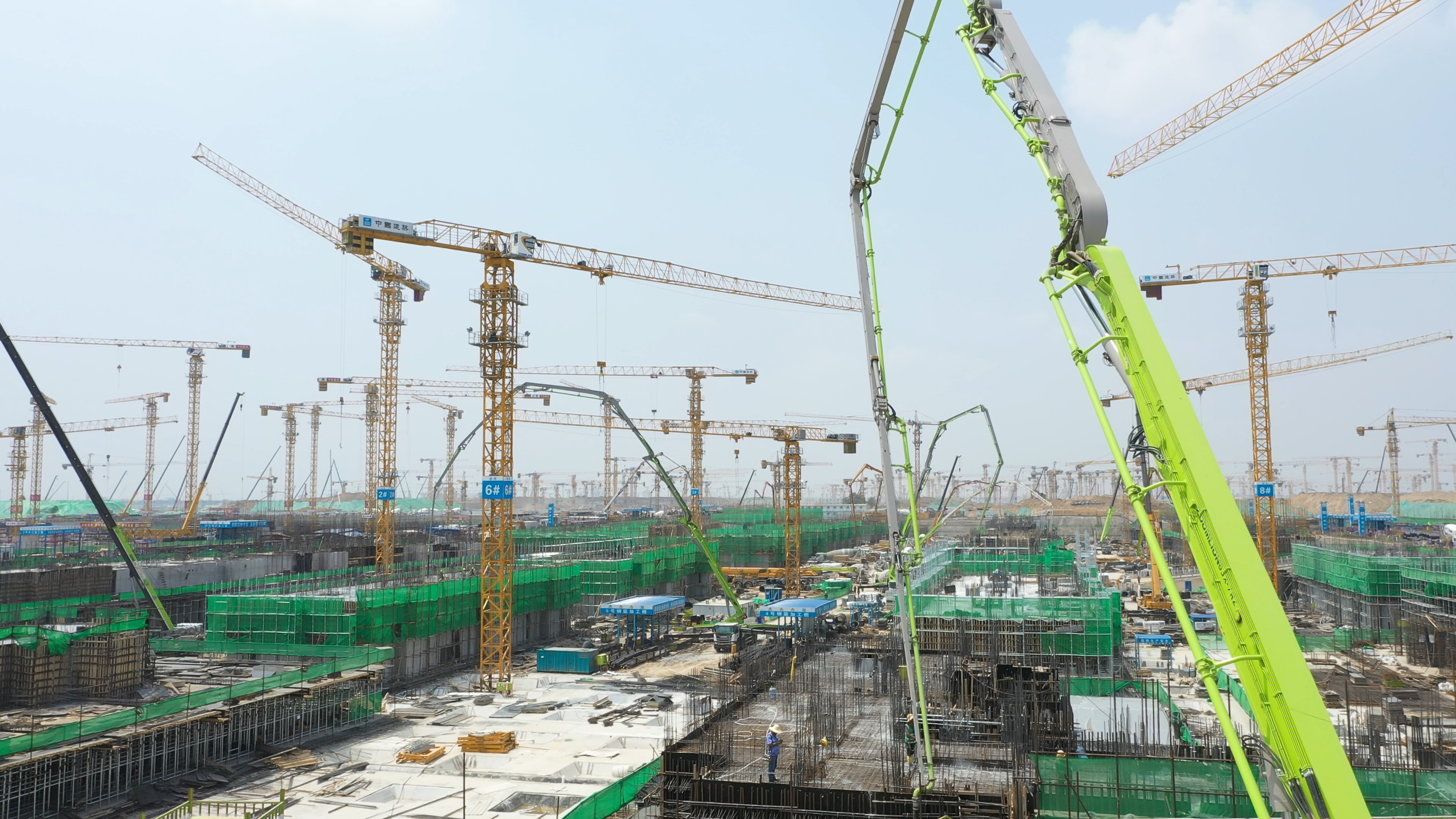 盛夏雄安,烈日炎炎,在廣大建設(shè)者拼搏奮斗下,雄安新區(qū)各重大項(xiàng)目建設(shè)捷報(bào)頻傳:京雄城際鐵路雄安站站房橢圓形水滴狀造型初現(xiàn),容東片區(qū)安置房及綜合管廊等工程均按時(shí)按質(zhì)完成節(jié)點(diǎn)任務(wù),雄安商務(wù)服務(wù)中心會(huì)展中心工程主體結(jié)構(gòu)7月底已封頂。在這座“未來(lái)之城”的建設(shè)現(xiàn)場(chǎng),中聯(lián)重科塔機(jī)林立、混凝土機(jī)械、汽車(chē)起重機(jī)等各類(lèi)設(shè)備成群作業(yè),熱火朝天的建設(shè)圖景甚為壯美。