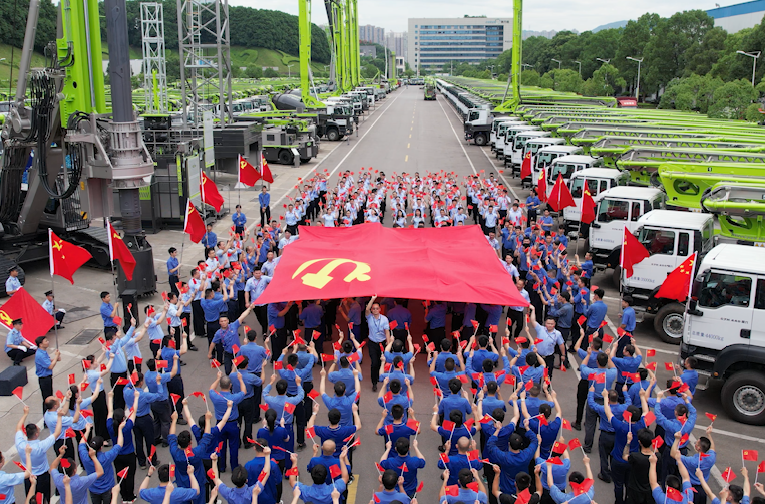 ?“百年奮斗感黨恩,薪火相傳千帆競。中聯(lián)重科熱烈慶祝中國共產(chǎn)黨成立100周年!”紅歌傳唱結束,大家一起揮舞手中的黨旗和國旗,為中國共產(chǎn)黨百年華誕送出祝福,昭示全體中聯(lián)人團結奮進的決心。偌大幅面的黨旗在隊列中傳送,中聯(lián)人“我心向黨”的決心亦噴涌而出,一浪高過一浪。