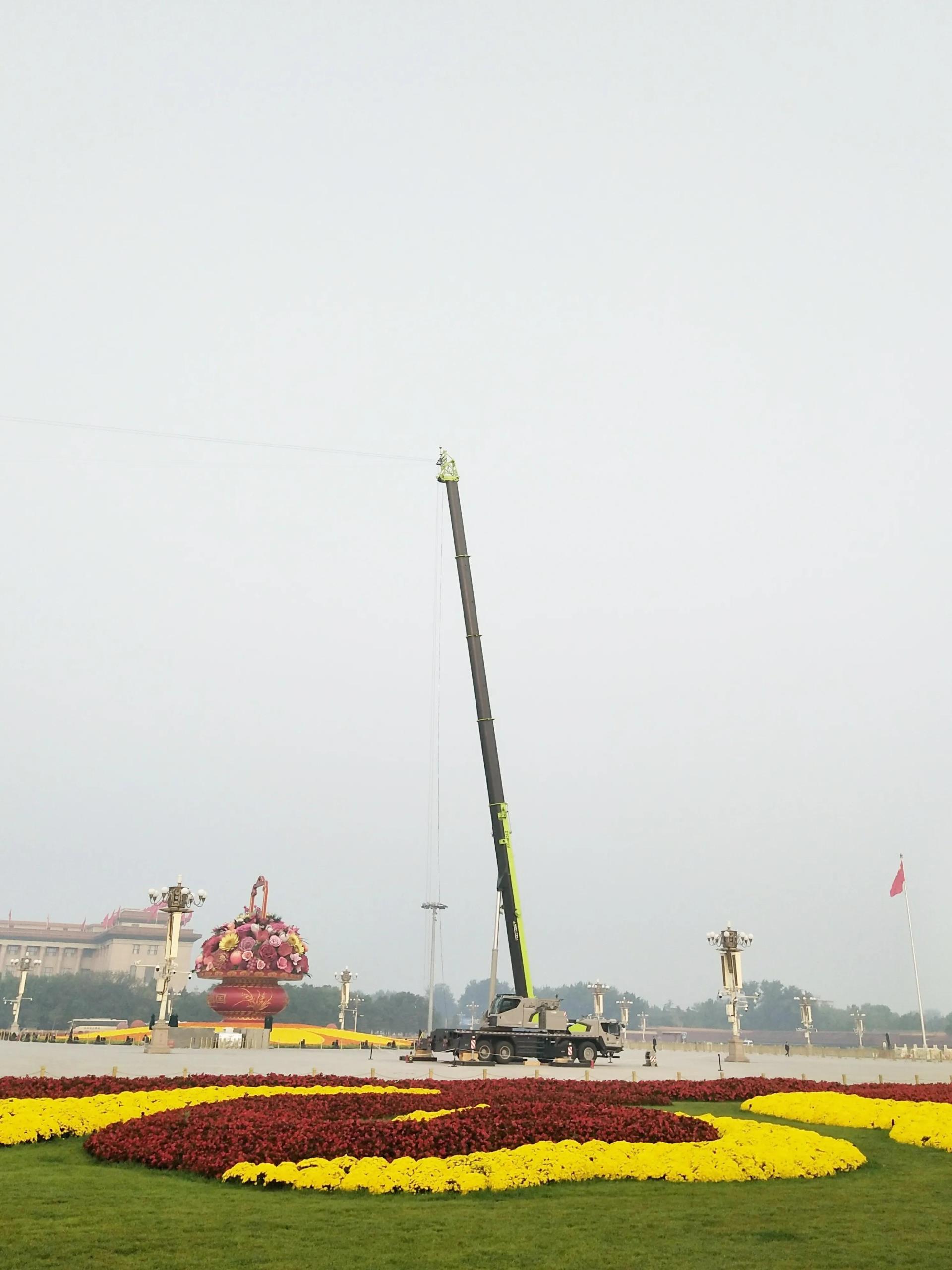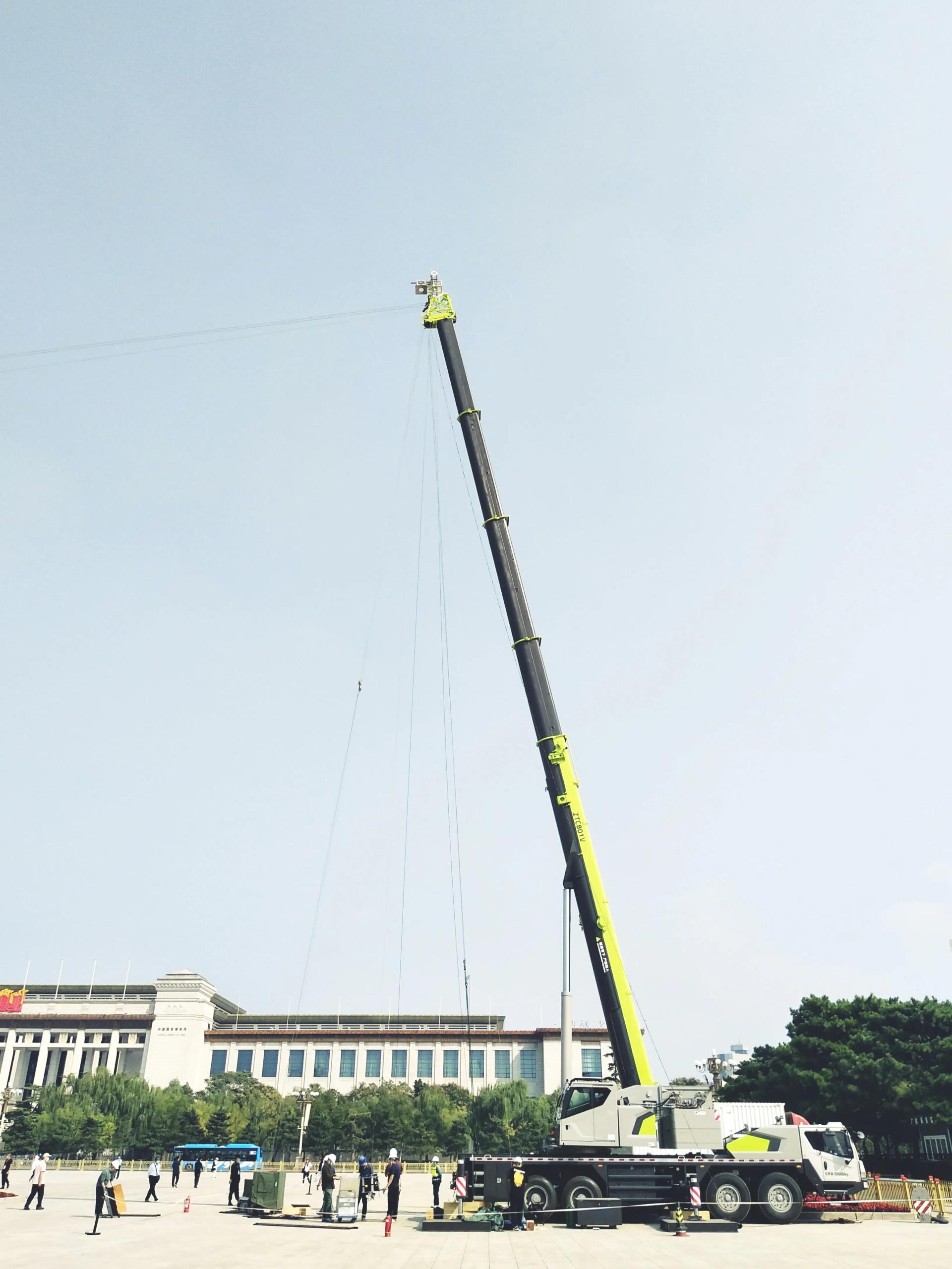 在儀式現(xiàn)場,天安門廣場南北兩側(cè)位置,兩臺“極光綠”汽車起重機以卓越品質(zhì)和穩(wěn)定性能支撐搭建起一條高40米、長300米的空中索道,其搭載的“天鷹座索道攝像系統(tǒng)”從高空完美呈現(xiàn)了整場活動的全景視角,讓廣大觀眾更真切地感受儀式的現(xiàn)場氛圍。