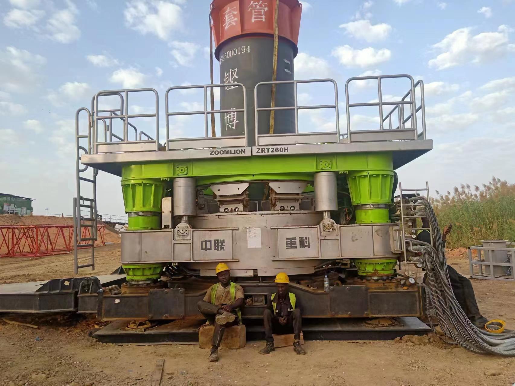 自設(shè)備今年2月進(jìn)場(chǎng)以來,中聯(lián)重科服務(wù)團(tuán)隊(duì)迅速完成了對(duì)當(dāng)?shù)厥┕と藛T的操作培訓(xùn),確保非洲工人能熟練使用全回轉(zhuǎn)鉆機(jī)。“非洲推行的歐標(biāo)禁止使用化學(xué)泥漿,全護(hù)筒工藝在這里用的很多,這次使用的全回轉(zhuǎn)鉆機(jī)ZRT260H,應(yīng)客戶要求打了根實(shí)驗(yàn)樁,下了55米護(hù)筒,樁深52米,由履帶吊快放取土成孔??蛻粼u(píng)價(jià)機(jī)器有勁,施工穩(wěn)定,護(hù)筒下的深,完全符合他們的預(yù)期。”中聯(lián)重科非洲駐點(diǎn)服務(wù)工程師佟兵介紹說。