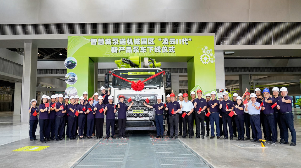 ▲在中聯(lián)智慧產(chǎn)業(yè)城泵送機械園下線的“凌云Ⅱ”新品泵車