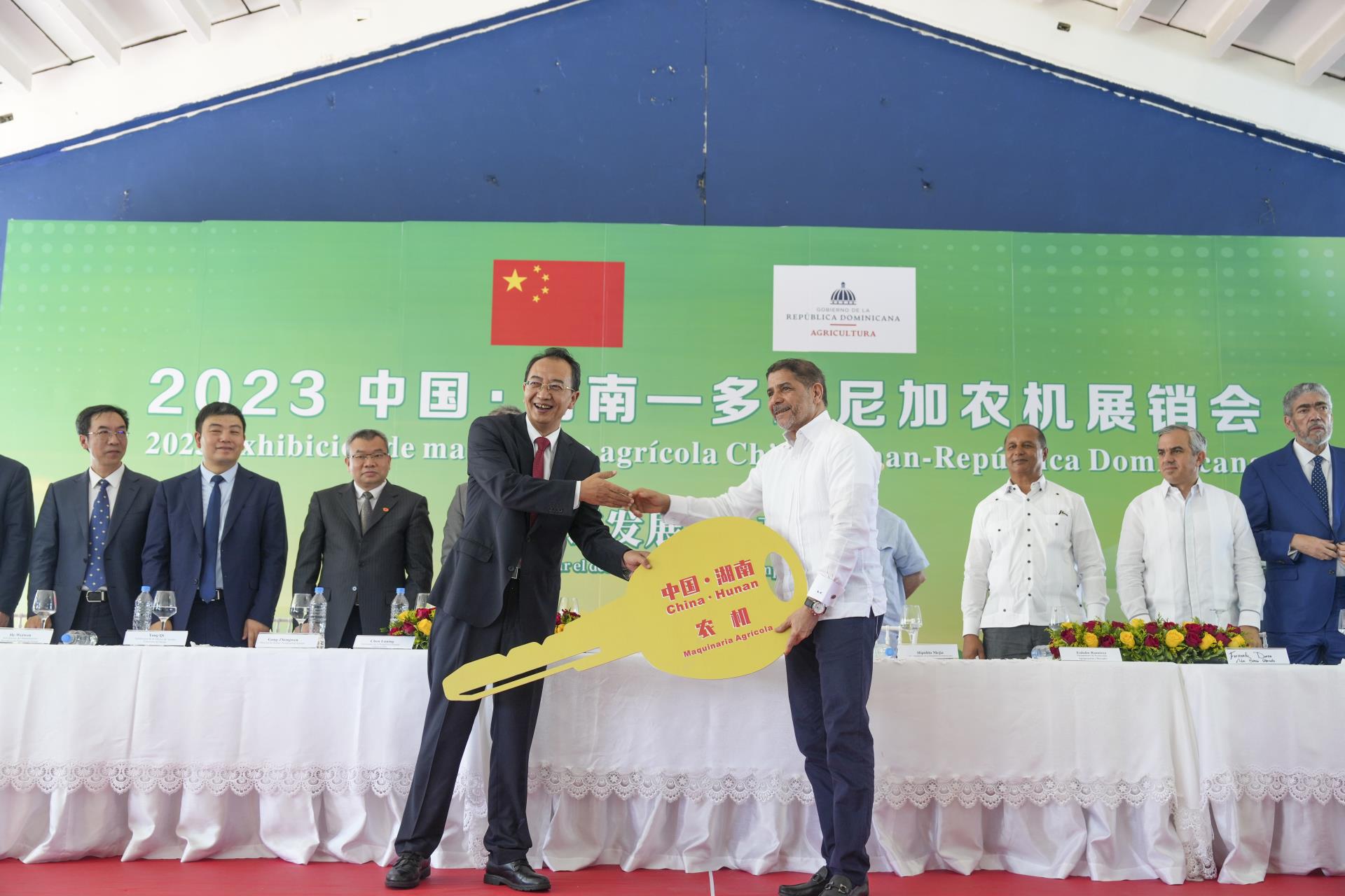 湖南省委常委、省委宣傳部部長(zhǎng)楊浩東,中國(guó)駐多米尼加大使陳魯寧,多米尼加前總統(tǒng)伊波利托·梅希亞,多米尼加農(nóng)業(yè)部部長(zhǎng)林博·克魯斯,中聯(lián)重科副總裁孫昌軍等出席開幕式。中國(guó)·湖南—多米尼加農(nóng)機(jī)展銷會(huì)為期3天,旨在加強(qiáng)湖南省與多米尼加在農(nóng)業(yè)領(lǐng)域的交流互鑒,深化雙方農(nóng)業(yè)合作,進(jìn)一步提高多米尼加農(nóng)業(yè)生產(chǎn)效率和質(zhì)量,為多米尼加農(nóng)業(yè)機(jī)械化、現(xiàn)代化發(fā)展增添新動(dòng)力,也為湖南省農(nóng)業(yè)企業(yè)國(guó)際化發(fā)展提供新機(jī)遇,實(shí)現(xiàn)互利共贏。
