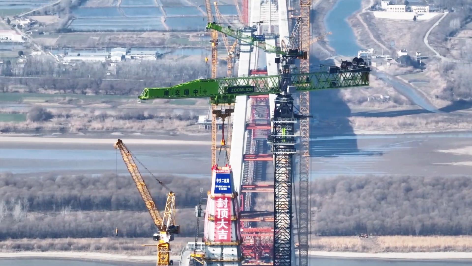 ▲中聯(lián)重科全球**大塔機完成馬鞍山長江公鐵大橋南主塔封頂?shù)跹b