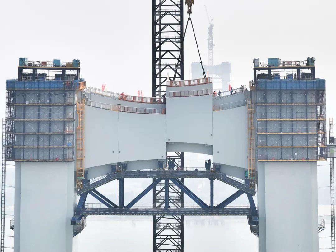 據(jù)了解,張靖皋長江大橋南航道橋主塔是大橋唯一一座江中主塔,建成后將成為世界**高懸索橋索塔。橫梁作為塔柱之間的支撐結(jié)構(gòu),其安裝精度直接影響到塔柱向上攀升的傾斜度和穩(wěn)定性,而中橫梁施工是橋塔的關(guān)鍵工程。此次安裝的中橫梁長34.4米,根部高19.2米,由4個(gè)節(jié)段構(gòu)成,總重約1000噸,其節(jié)段重量大、起重吊裝難度高、焊接精度要求高。