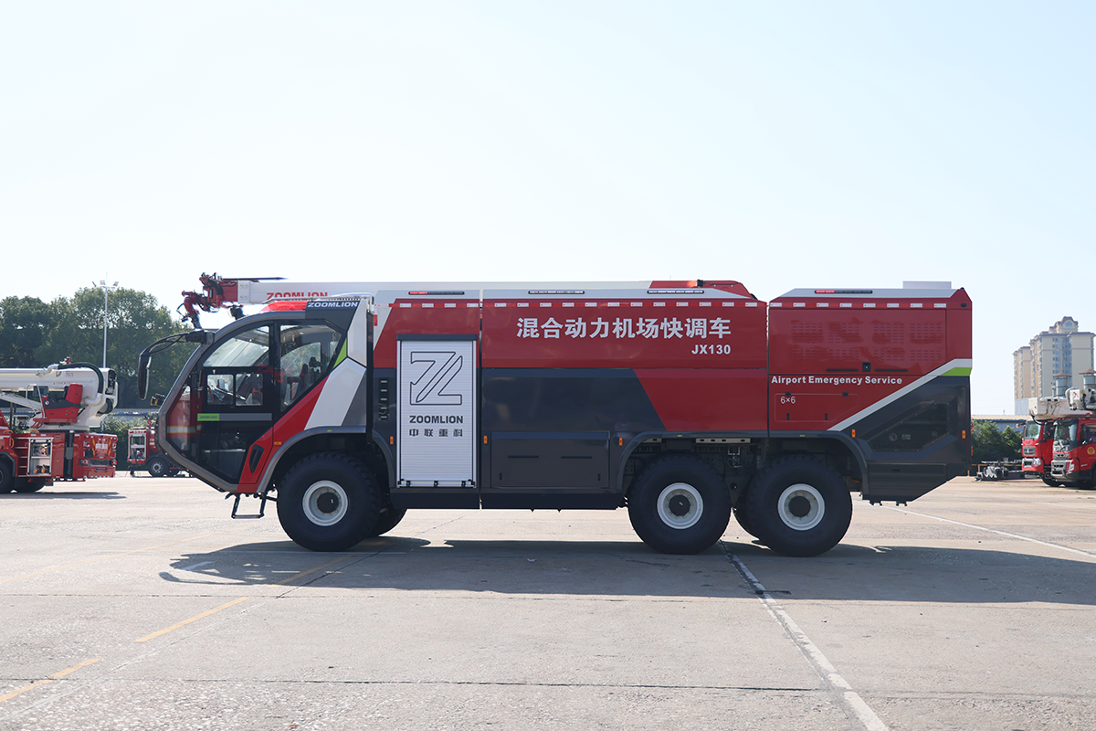 中聯(lián)牌JX130是國內(nèi)首款混合動力驅(qū)動的機場快調(diào)消防車。該車采用雙動力驅(qū)動,具備超強的行駛加速性能;配有大容量滅火劑罐,搭載智能的滅火噴射系統(tǒng)和高強度穿刺臂,快速撲救飛行器火災(zāi),是各類機場必備的火災(zāi)救援核心裝備。