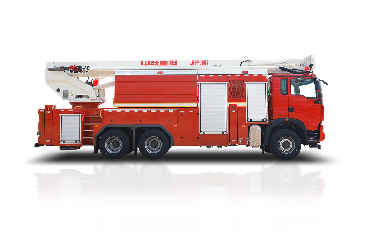中聯(lián)牌36米舉高噴射消防車(以下簡稱高噴車)是一種消防高空滅火裝備,主要用于城鎮(zhèn)、工礦企業(yè)高層建筑以及石油、化工、油罐、倉庫等高大建筑物的火災(zāi)撲救。該車選用重汽HOWO專用底盤改裝,裝備美國希爾RSD100型中低壓消防泵,整車外形美觀、動力強(qiáng)勁、操作方便、作戰(zhàn)速度快、射程遠(yuǎn)、流量大。本高噴車可全方位回轉(zhuǎn),各機(jī)構(gòu)性能均由液壓驅(qū)動,操作簡便靈活,消防實(shí)戰(zhàn)滅火作業(yè)時展開迅速,運(yùn)作平穩(wěn),安全可靠。本車帶有水罐、消防泵,臂架頂端的消防炮射程遠(yuǎn),流量大,即可打直流,又可噴霧,可以在距火源較遠(yuǎn)的位置獨(dú)立完成救火作業(yè),是當(dāng)今世界上較理想的高空消防滅火裝備。