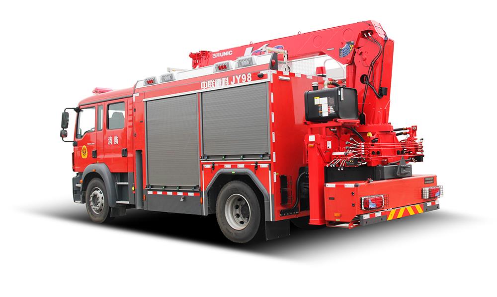 中聯(lián)重科JY98型搶險救援消防車,結(jié)合國內(nèi)外消防車的先進(jìn)理念和消防實戰(zhàn)創(chuàng)新設(shè)計而成,整車結(jié)構(gòu)緊湊,越障能力強,可裝備絞盤、升降照明系統(tǒng)、起吊機、液壓破拆工具組、偵檢器具、救生器具等超過98件搶險救援器材,是集照明、供電、牽引、起吊、破拆、偵查、救援等功能于一體的多功能消防車,具備強大的搶險功能和綜合救援能力,是火災(zāi)、地震、抗洪、車禍等各類災(zāi)害搶險救援的主力車型。