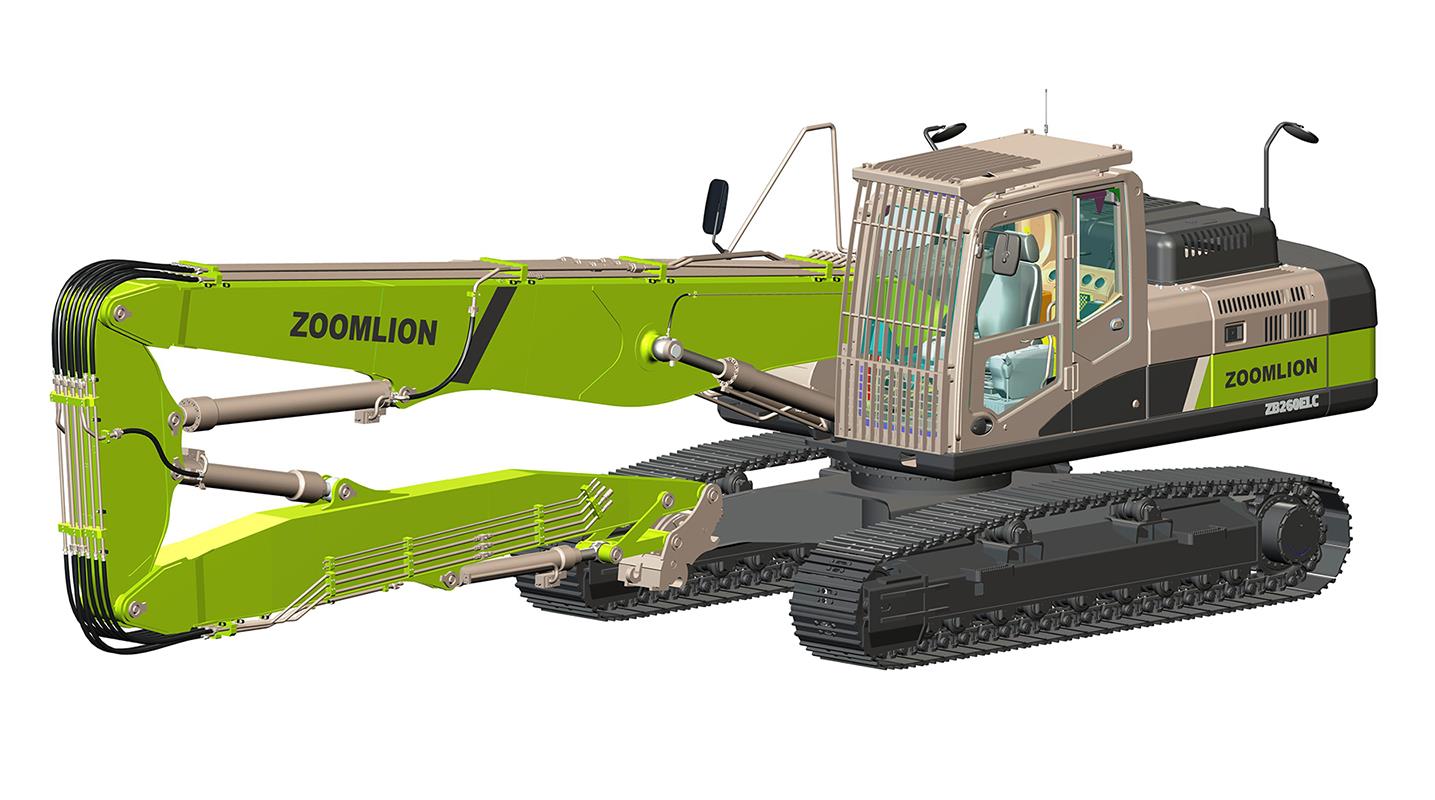 ? ? ?整機由下部結構、上部結構、作業(yè)裝置三大部分組成。下部結構為液壓驅(qū)動的履帶式行走機構,通過回轉裝置與上部結構連接。上部結構包括發(fā)動機、液壓系統(tǒng)、轉臺、駕駛室、控制系統(tǒng)等,作業(yè)裝置包括臂架部分和作業(yè)屬具,臂架采用鉸接式三節(jié)臂結構,頂端通過快換裝置連接作業(yè)屬具(液壓錘、液壓剪、抓斗 、載人平臺、起吊裝置), 并通過快換式液壓管路為作業(yè)屬具提供動力,實現(xiàn)破拆、挖掘、搬運、舉高、救援等多種作業(yè)任務。